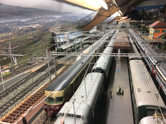 Zurück zu Modelleisenbahnen. Und zwar nicht zu irgendeiner, sondern zur grössten Spiel- und Hobbyeisenbahn in Spur 0. Vor dem Panoramabild des Alpsteins drehen bis zu 15 Züge bei den regelmässigen Vorführungen (vier pro Tag) ihre Runden. Dann leuchtet und rattert alles.