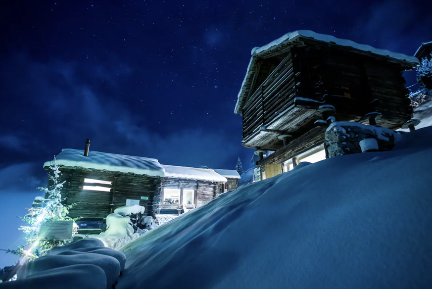 Wir starten mit dieser Blockhütte im Val d'Hérens, die für zwei Personen Platz bietet. Im unteren Teil wurde der alte Stall in einen Wohnraum mit Cheminée umgebaut, oben gibt's vom Zimmer aus Blick auf den Dent Blanche.