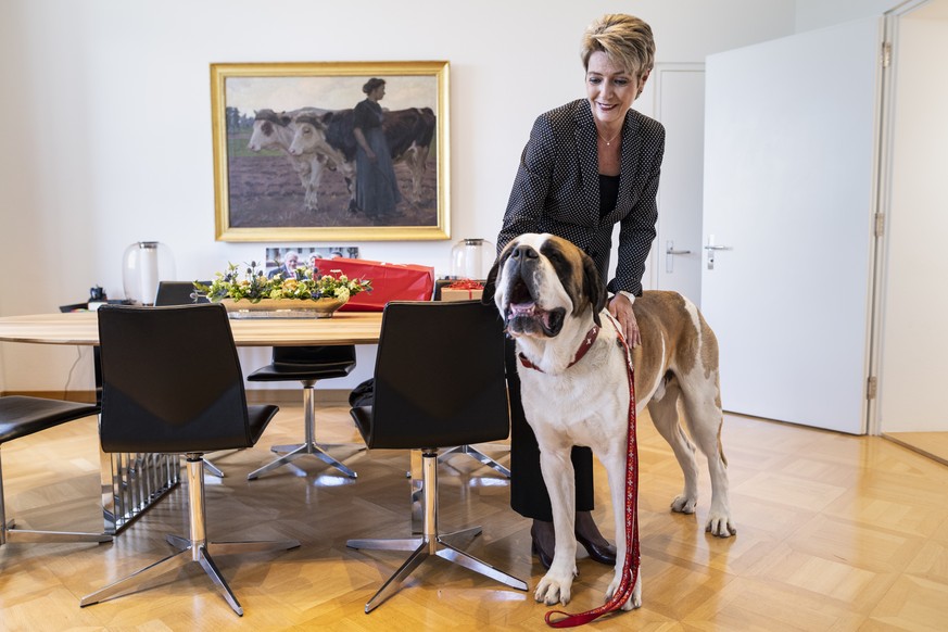Justizministerin Karin Keller-Sutter mit ihrem Patenhund Zeus (der rund 77 Kilogramm schwer ist). Bild: keystone