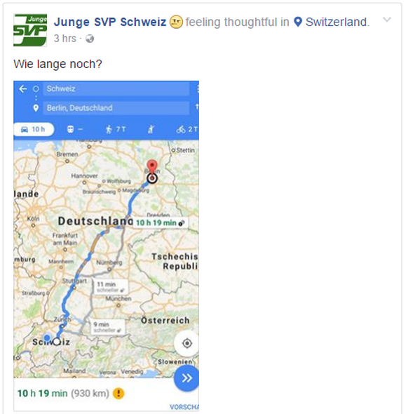 Deutlich weniger vorsichtig äussert sich die «Junge SVP Schweiz» zum Vorfall. In einem Facebook-Beitrag stellt sie am Montagabend die Frage «wie lange noch?» – und postet dazu eine Wegbeschreibung von Berlin bis in die Schweiz. «Gezielt wurde der Angriff auf einen Weihnachtsmarkt durchgeführt, wohl um möglichst viele Christen mit sich zu nehmen», heisst es auf der Facebook-Seite der Jungen SVP Schweiz weiter.