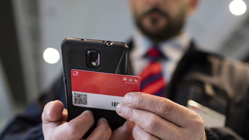 Ein Kondukteur liest den Swisspass. Die SBB behalten Daten von Reisenden auf.