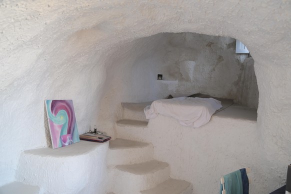 Zuerst lebte ich in einer Eselsgrotte. Diesen Stall habe ich dann ausgebaut, ein Fenster und eine Türe gebaut, ein Bett und einen Tisch reingestellt und mit weissem Zement verputzt. Später baute ich auf meinem Grundstück im Tuffstein zwei weitere Grotten. So lebten die Menschen hier früher auch.