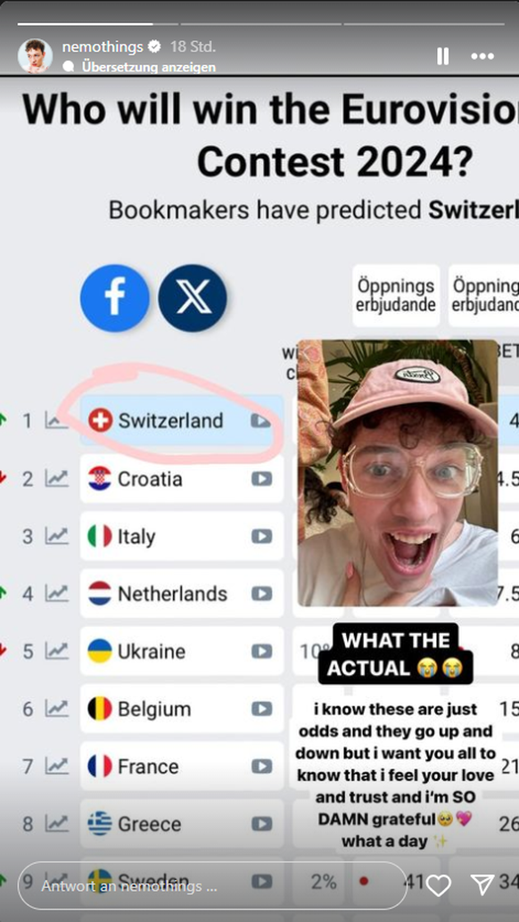 Und Nemo hat das Publikum offenbar überzeugt. Denn nach dem Auftritt schnellte der Schweizer Beitrag am Montag bei den Wettbüros auf den ersten Platz. Nemo löst mit «The Code» den bisherigen Favoriten, Baby Lasagna aus Kroatien, ab.