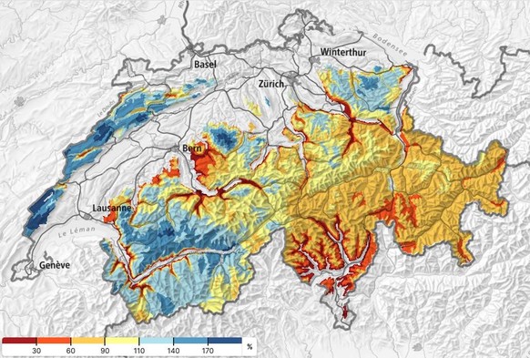 Besonders in den östlichen Alpen liegt aktuell sehr viel weniger Schnee als normal. Das rührt auch von den Niederschlagsmengen her, die regional starke Unterschiede aufweisen. So fiel besonders im Bündnerland unterdurchschnittlich wenig Niederschlag, «sonst aber war es in der Regel zu nass, im Westen und im Wallis sowie im Norden zum Teil sogar massiv», schreibt MeteoNews. In Visp und in Genf fiel beispielsweise mehr als das vierfache der durchschnittlichen Menge.