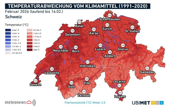 Die aktuelle Wettersituation im Wallis lässt diesen Schluss nur schwer zu, doch die erste Hälfte des Februars war deutlich milder als im langjährigen Schnitt. Das zeigt diese Karte von MeteoNews: