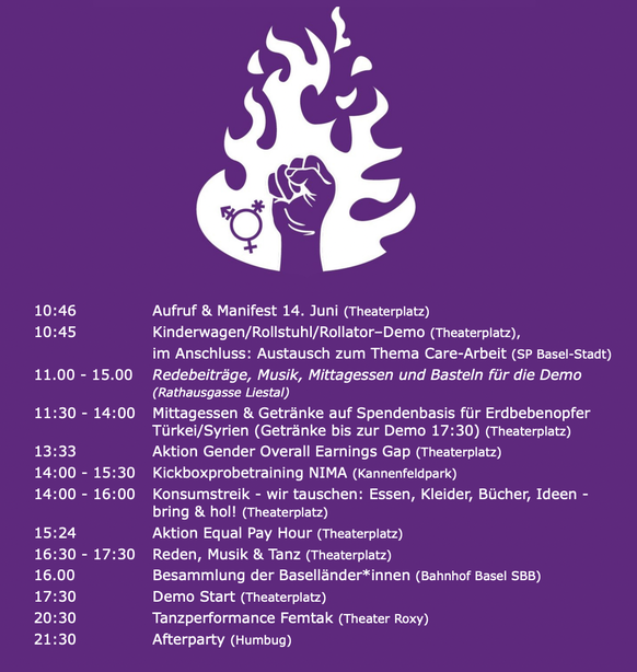 Das feministische Frauenstreikkollektiv Basel hat für den ganzen Tag ein grosses Programm zusammengestellt, darunter eine Kinderwagen-/Rollstuhl-/Rollator-Demo, einen Tauschhandel sowie ein Mittagessen auf Spendenbasis für Erdbebenopfer in der Türkei und Syrien. Die offizielle Demonstration beginnt um 17.30 Uhr am Theaterplatz. Die Bewilligung wurde eingereicht.