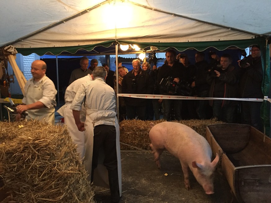 Seit Wochen wurde gestritten: Darf man das? Ja, soll man sogar? Nun ist der Tag da, an dem in Sissach BL zwei Schweine vor den Augen des Publikums geschlachtet und zu Würsten verarbeitet werden.
