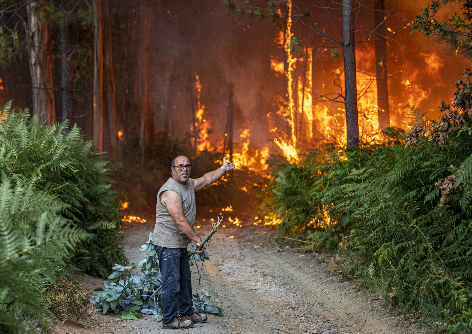 Ein Anwohner versucht, mit einem Ast ein Feuer zu löschen, als er sieht, dass die Waldgebiete um sein Haus herum brennen.