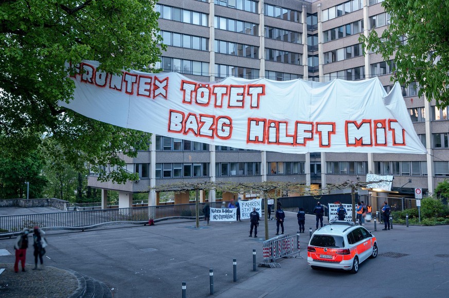 Rund 30 Aktivistinnen und Aktivisten haben am Freitagmorgen den Eingang zum Bundesamt für Zoll und Grenzsicherheit (BAZG) in Bern blockiert. Damit protestierten sie gegen die Erhöhung des Schweizer Beitrags an die EU-Grenzschutzorganisation Frontex.
