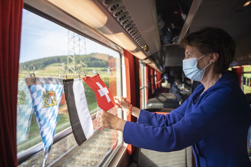 2021: Sommaruga hängt eine Schweizer Fahne im europäischen Sonderzug Connecting Europe Express (CEE) auf. Bild: KEYSTONE