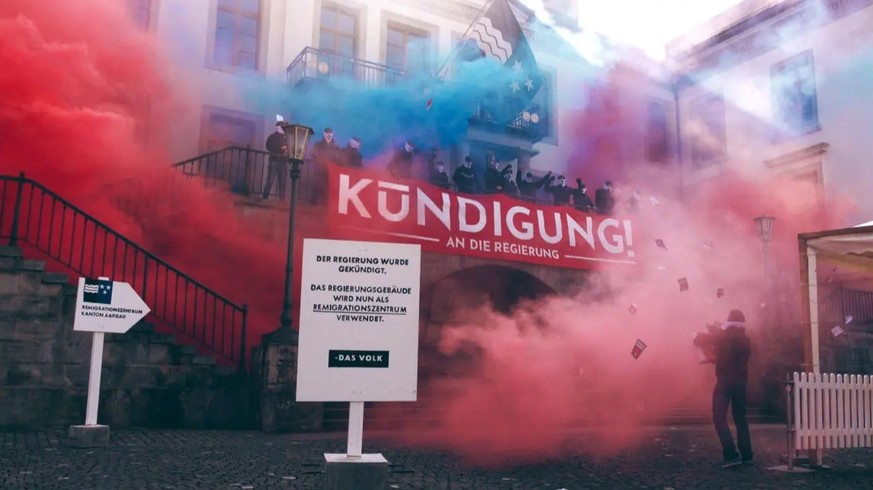 Vor dem Aargauer Regierungsgebäude steigt roter Rauch auf. Vermummte recken die Fäuste in die Höhe und skandieren: «Jugend leistet Widerstand.» Es ist ein Protest dagegen, dass Wohnungsmieter auf Wunsch der Behörden Asylsuchenden Platz machen sollen. Die Vermummten haben eine weisse Tafel aufgestellt, darauf steht: «Das Regierungsgebäude wird nun als Remigrationszentrum verwendet.» Gezeichnet: Das Volk.