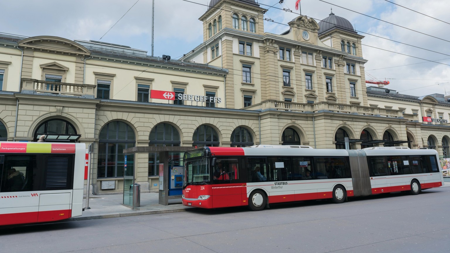 Winterthur, ZH / Switzerland - April 8, 2019: Winterthur train station with city buses waiting at the bus stop