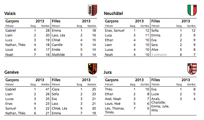 In der französischen Schweiz ist seit 2004 Emma die Nummer 1, 2013 vor Chloé und Léa. Bei den Knaben lag Gabriel an der Spitze. Dahinter folgten Liam und Théo. In der italienischen Schweiz nahmen 2013 Gabriel, Leonardo und Mattia sowie Sofia, Emma, Emily und Giulia die Spitzenpositionen ein.