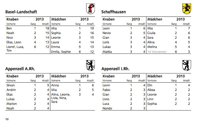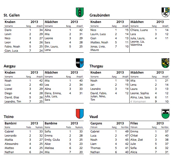 Bei der Wahl des Vornamens unterscheiden sich die Vorlieben von Kanton zu Kanton. Gesamtsiegerin Mia steht in der Deutschschweiz lediglich in Bern, Luzern, Baselland, Schaffhausen, Aargau und Thurgau ganz vorne in der Gunst der Eltern. Noah erreicht sogar nur in drei Kantonen Rang eins, nämlich in Bern, Aargau und Thurgau. In Bern teilt sich der Vorname den Spitzenplatz zudem mit Leon. In Zürich wiederum waren die beliebtesten Vornamen 2013 David und Lea. (whr/sda)