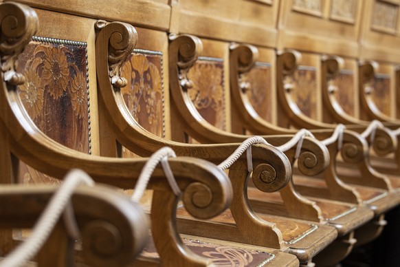Sicht auf abgesperrte Staenderatssitze bei der Bundesversammlung im Nationalratssaal, am Donnerstag, 3. September 2020, im Bundeshaus in Bern. Die Arbitsplaetze im Nationalrat-und Staenderatssaal, sow ...