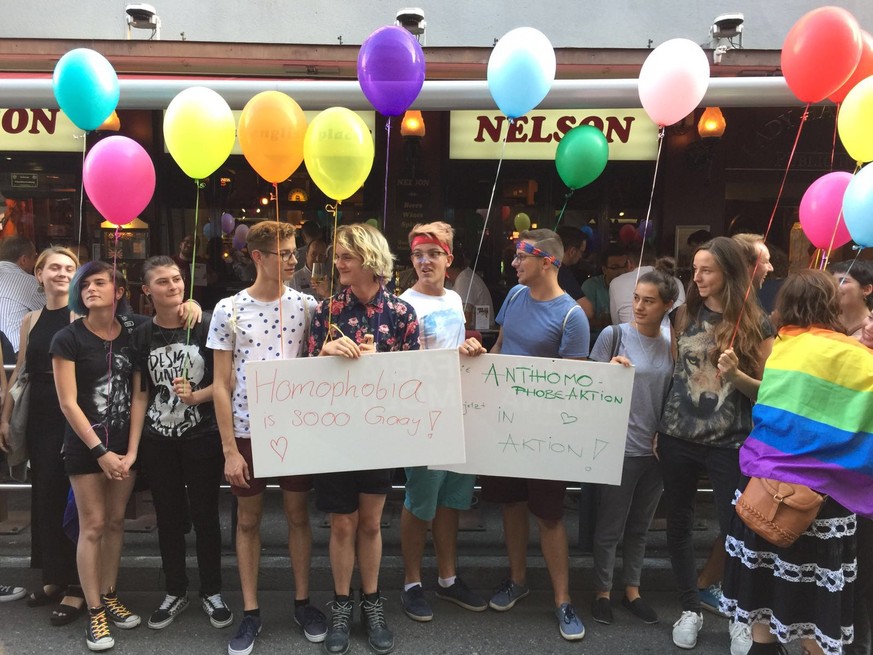 Rund 50 Aktivistinnen und Aktivisten versammelten sich am 14. September vor dem Lokal, das nach dem Rausschmiss eines schwulen Pärchens am Samstag im Fokus der LGBT-Gemeinde steht. Sie wollen zeigen: «Wir dürfen uns küssen – wo und wann wir wollen.»