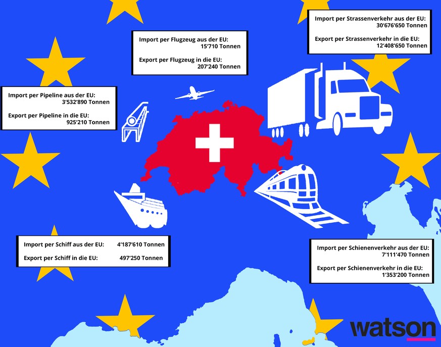 Die Schweiz importierte 2015 Waren im Wert von 166 Milliarden Franken, 120 Milliarden aus der EU. Am meisten importierten wir aus Deutschland, nämlich 28 Prozent. Darauf folgen Italien (10 Prozent), Frankreich (8 Prozent) und Österreich (4 Prozent).