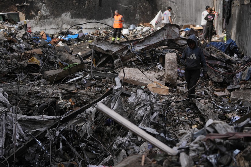 A boy walks through debris as others work in the background at the site of a building destroyed in an Israeli airstrike last Wednesday in central Beirut, Lebanon, Tuesday, April 14, 2026. (AP Photo/Ha ...