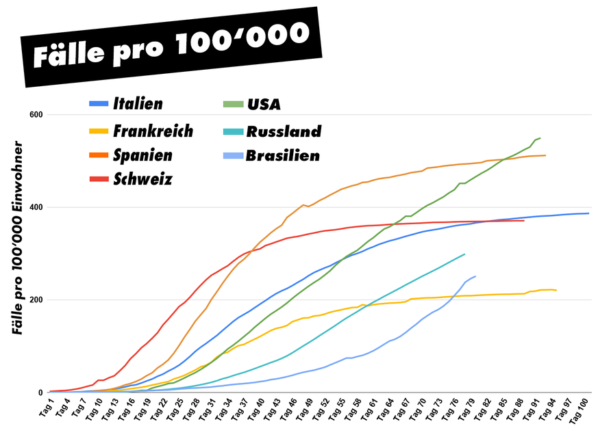 Die enorme Anzahl Fälle hängt in den USA natürlich auch mit der grössten Anzahl Einwohner zusammen. Rechnen wir die gemeldeten Fälle von ausgewählten Ländern auf 100'000 herunter, sieht es da noch etwas freundlicher aus (siehe weiter unten).