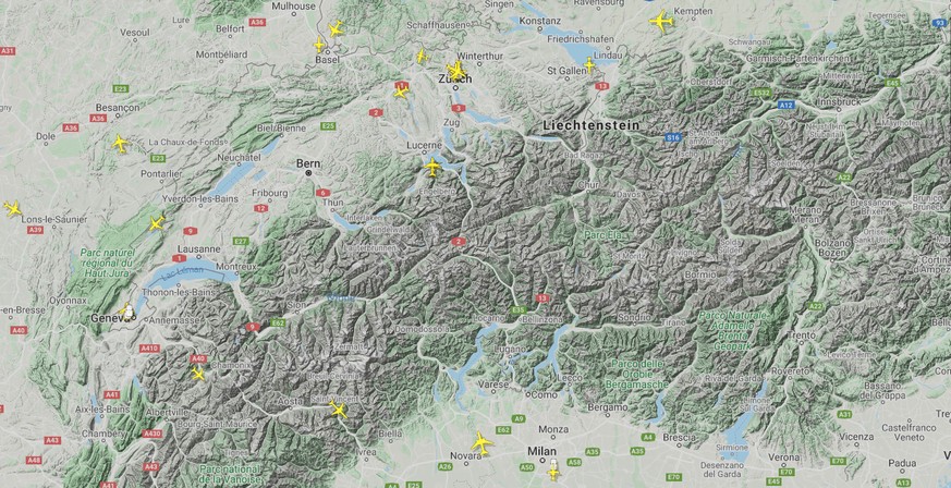 Wie oben versprochen, haben wir bei Flightradar24.com die Grafiken bestimmter Weltgegenden von heute 11 Uhr mit denjenigen von vor einem Jahr (Montag, 25. März 2019, 11 Uhr) verglichen. So sehen die Himmel über verschiedenen Gebieten der Welt aktuell aus: