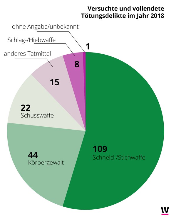 Ebenfalls ähnlich wie in den bisherigen Jahren ist die Aufteilung: Rund drei Viertel der Tötungsdelikte sind versuchte, ein Viertel vollendete.