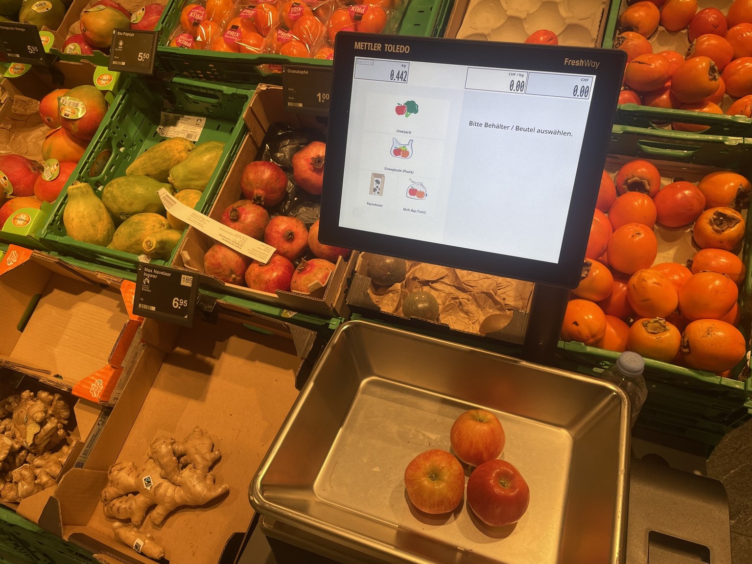 Migros und Coop haben ihre Waagen bereits umgestellt. Dort erscheint jetzt nach jedem Wiegen eine zusätzliche Aufforderung. Die neue Regelung gilt jedoch auch für Aldi und Lidl, bei denen das Personal an der Kasse das Obst und Gemüse wiegt.
