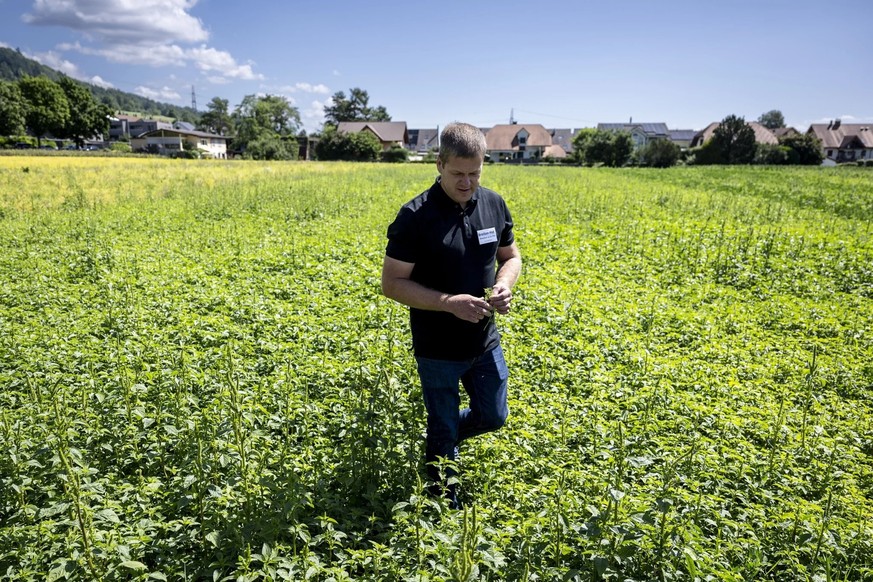 Ist das Unkraut, das da spriesst? Auf den ersten Blick ist nicht erkennbar, was Familie Tellenbach auf dem Feld inmitten von Pieterlen BE anbaut. Schliesslich handelt es sich um Kulturen, die man in der Schweiz nur selten zu Gesicht bekommt: Quinoa, Ackerbohnen, Kichererbsen und andere Hülsenfrüchte wachsen auf den paar Hektaren zwischen Wohnquartier und Bahnlinie.