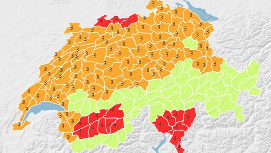 Gefahrenstufe 4 bedeutet «grosse Gefahr». In diesen rot eingefärbten Zonen muss mit Tageshöchstwerten von 35 bis 39 Grad gerechnet werden, für die sonst weit verbreitete Gefahrenstufe 3 («erheblich») gilt eine Temperaturspanne von 32 bis 37 Grad. (sda)