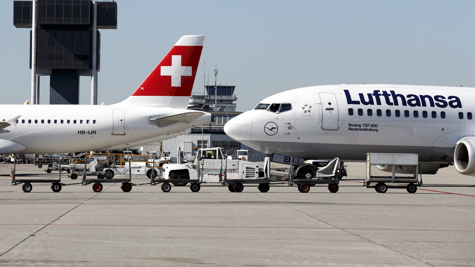 Ein Swiss- und ein Lufthansa-Flieger am Flughafen in Genf.Bild: KEYSTONE