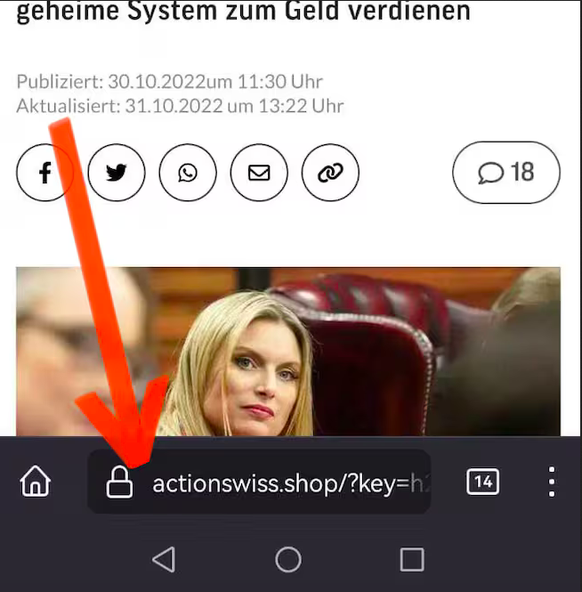 Das oben gezeigte Fake-Inserat verspricht etwa einen «Blick»-Beitrag über die Sendung «‹Die Höhle der Löwen›, die Schweizer reich» machen soll. Drückt man dann auf den Beitrag, landet man plötzlich auf einer Website mit der URL von «Actionswiss.shop» anstatt von «Blick.ch».