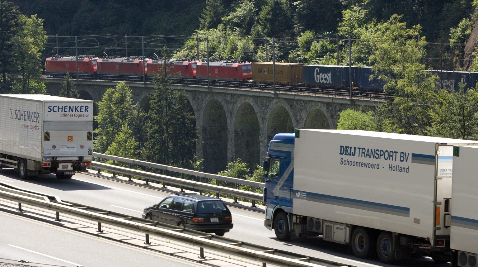 Innerhalb der Schweiz verzeichnete der Schwerverkehr auf der Strasse einen Rückgang von 5 Prozent. Die Bahn legte hingegen um 5 Prozent zu. (pre/sda)