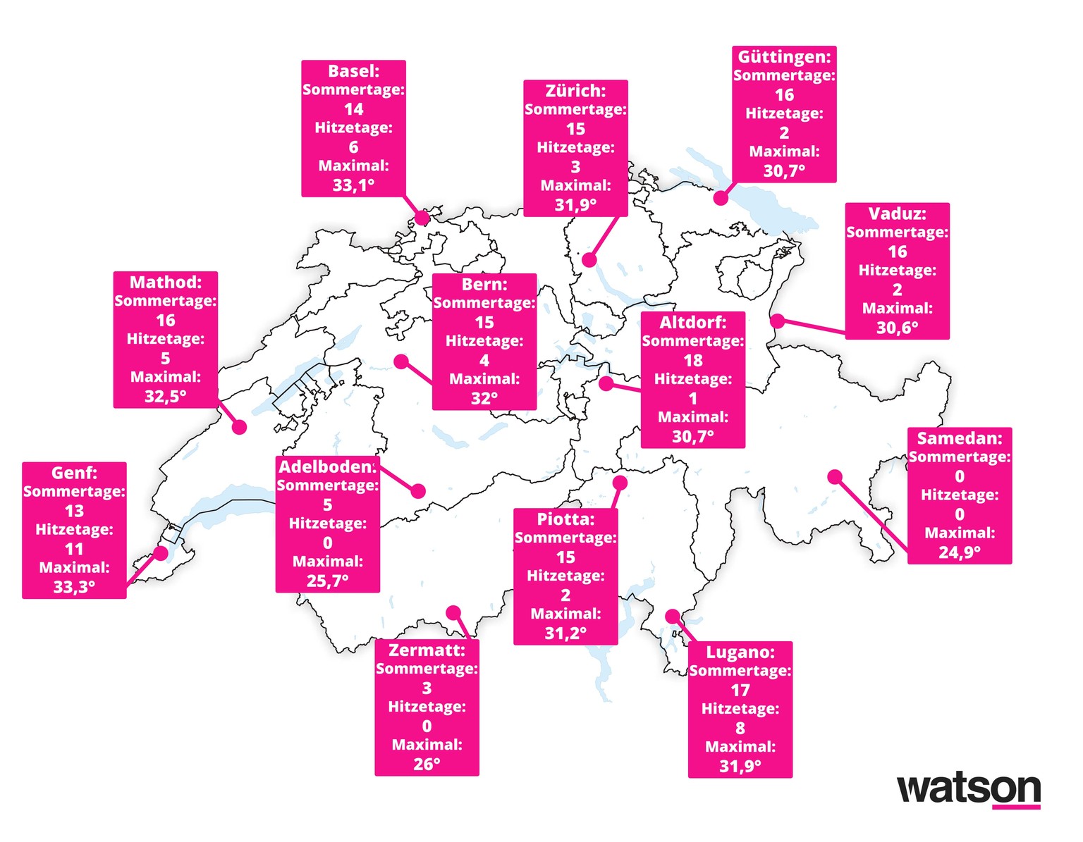 Bei einer Beschränkung auf diese Auswahl betrug die höchste gemessene Temperatur in der Schweiz im Juli bisher 33,3 Grad – und zwar in Genf. Genf hatte sogar mehr Hitzetage (Maximaltemperatur über 30 Grad) als Lugano. Auch in den Städten Basel, Bern und Zürich wurden im Juli viele Hitzetage gemessen.