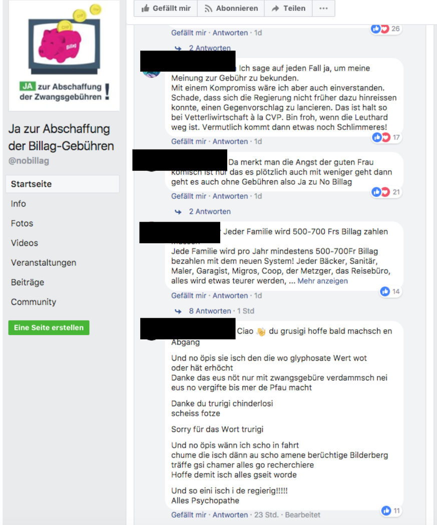 Die Betreiber der Facebookseite scheinen aber die Hasskommentare nicht in den Griff zu kriegen. So kommentierte ein männlicher User einen Post über Doris Leuthard und bezeichnete darin die amtierende Bundesrätin als «trurigi chinderlosi sch*** f***». Der Post steht dort seit bereits 23 Stunden und wurde nicht entfernt.
