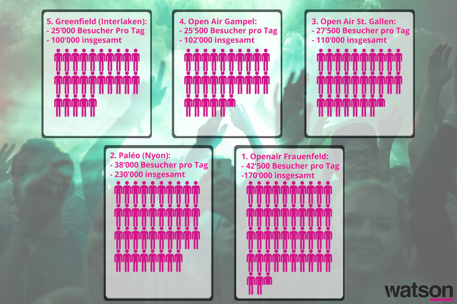 199 Bands spielten am Montreux Jazz Festival. Das ist nicht sehr erstaunlich, wenn man bedenkt, dass dieses 16 Tage dauert – macht durchschnittlich 12 Bands pro Tag. Auch das zweitplatzierte Paléo-Festival dauert länger als die meisten anderen Open Airs, nämlich sechs Tage. Am Zürich Open Air spielten 90 Bands und DJs innert vier Tagen. Eine geballte Ladung von 22 Acts pro Tag.