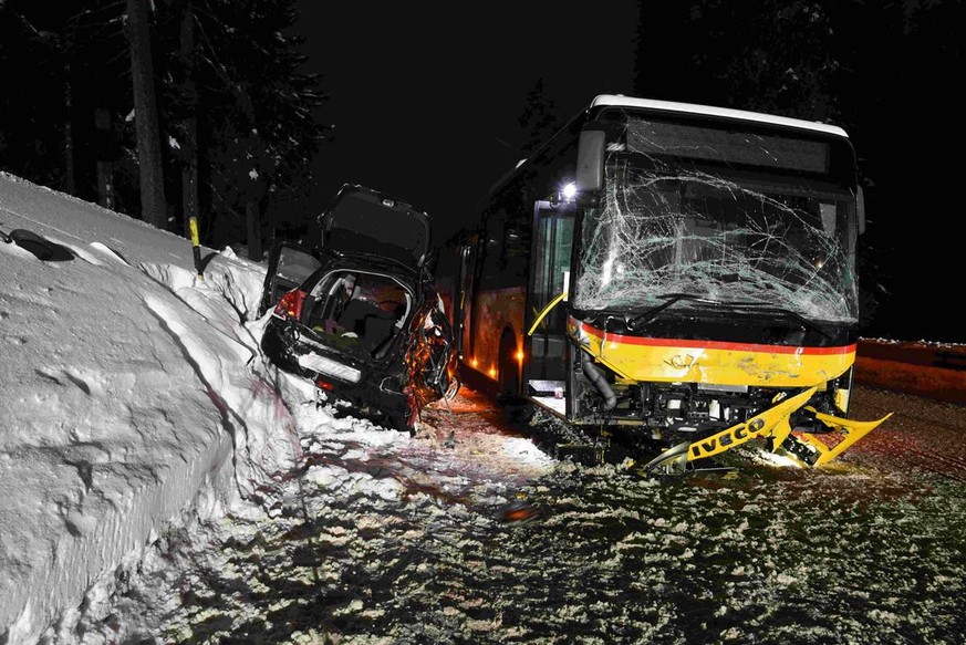 Der PKW sei ausgangs der langgezogenen schneebedeckten Rothornkurve mit dem Postauto kollidiert. Beide Insassen verstarben laut Mitteilung noch auf der Unfallstelle.