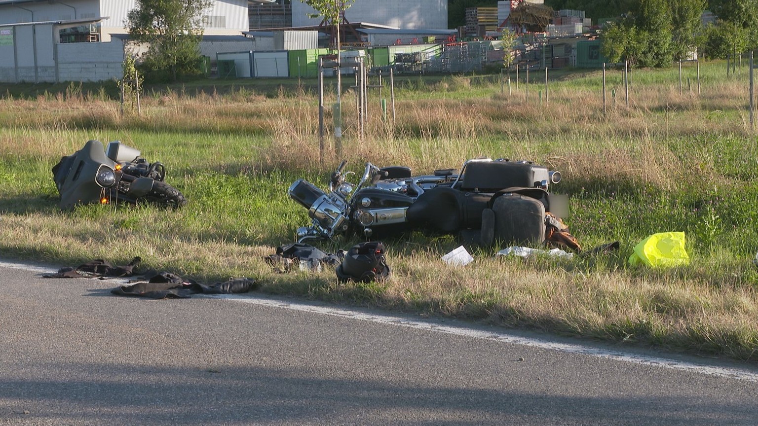 Einer der Töffs liegt im Rasen neben der Strasse.Bild: BRK News