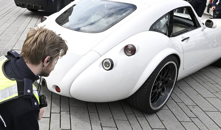 Ein deutscher Polizist kontrolliert ein getuntes Auto (Symbolbild).Bild: DPA