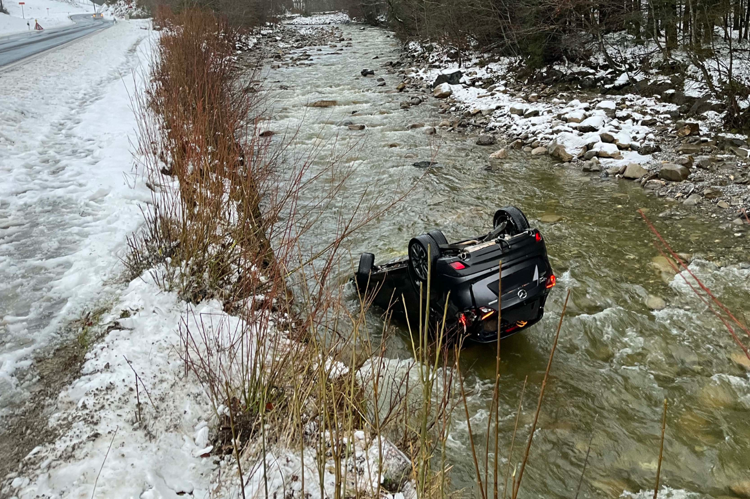 Das Auto stürzte mehr als drei Meter eine Böschung hinunter und landete im Fluss Waldemme – wo es auf dem Dach zum Liegen kam.