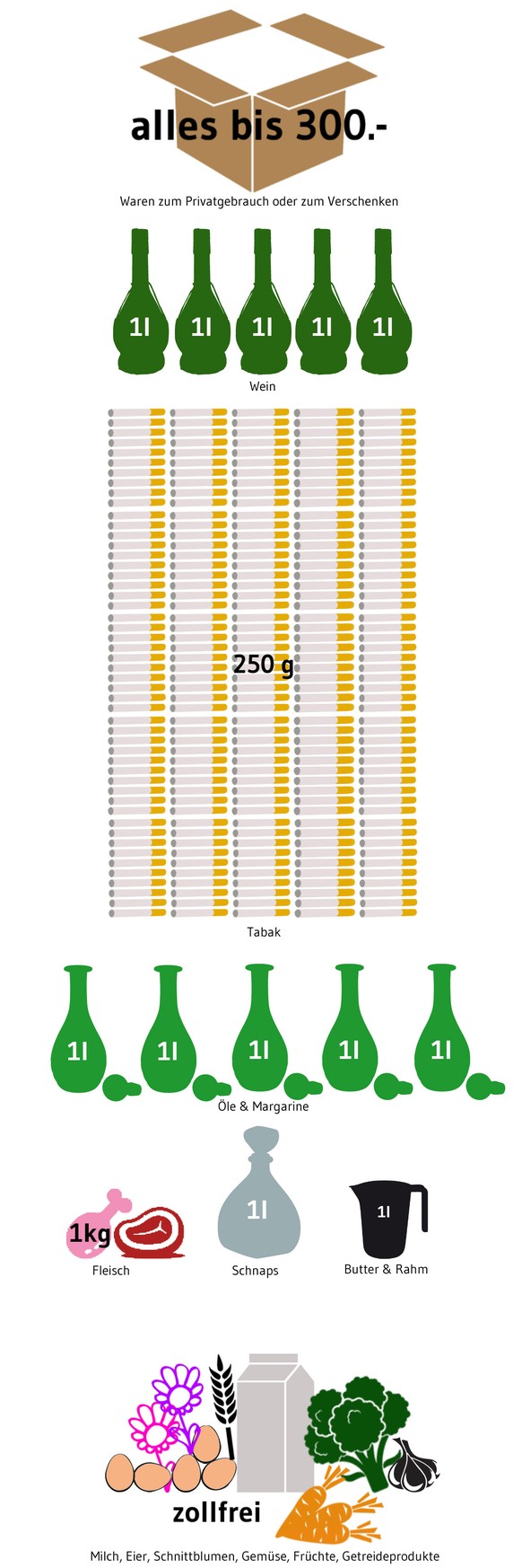 Der Schweizer Zoll hat per 1. Juli 2014 die Einfuhr-Bestimmungen vereinfacht. Die Konsumenten freuts. Sie dürfen künftig von allem mehr einführen als bisher: mehr Wein, mehr Tabak, Gemüse so viel sie wollen. watson zeigt, was ennet der Grenze alles im Einkaufskorb landen darf.