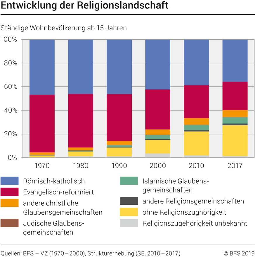 Bis in die 1980er Jahre haben noch über 90 Prozent der Einwohner der Schweiz einer der beiden Landeskirchen angehört. Heute sind es noch knapp 60 Prozent. Mehr als ein Viertel der ständigen Wohnbevölkerung über 15 Jahren ist mittlerweile ohne religiöse Zugehörigkeit.