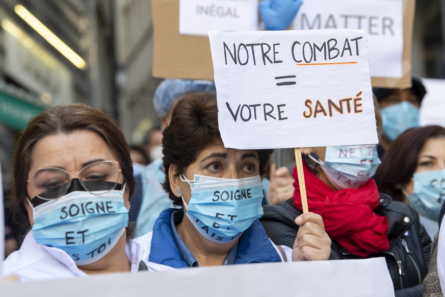 Le personnel de differents institutions genevoise de soins manifestent, ce samedi 31 octobre 2020 a Geneve. Car ils sont dans un contexte sanitaire tres tendu et les institutions de soins sont au bord ...