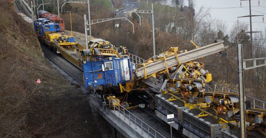 Ein Schotterwagen wurde aus den Schienen katapultiert und kam quer über die Geleise zu stehen. Dieses Bild bot sich einem sda-Korrespondenten an einer Medienkonferenz vor Ort.