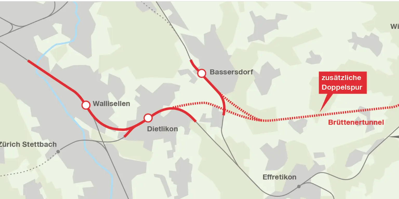 Der Mehrspurausbau Zürich-Winterthur wird eine zusätzliche Doppelspur auf einer der meistbefahrenen Strecken des Landes bringen. Kernstück ist der Brüttenertunnel, der 9 Kilometer lang sein wird. In den zwei einspurigen Röhren können die Züge bis zu 160 km/h fahren. Zusätzlich zum neuen Tunnel werden die vier Bahnhöfe Winterthur-Töss, Bassersdorf, Wallisellen und Dietlikon ausgebaut.