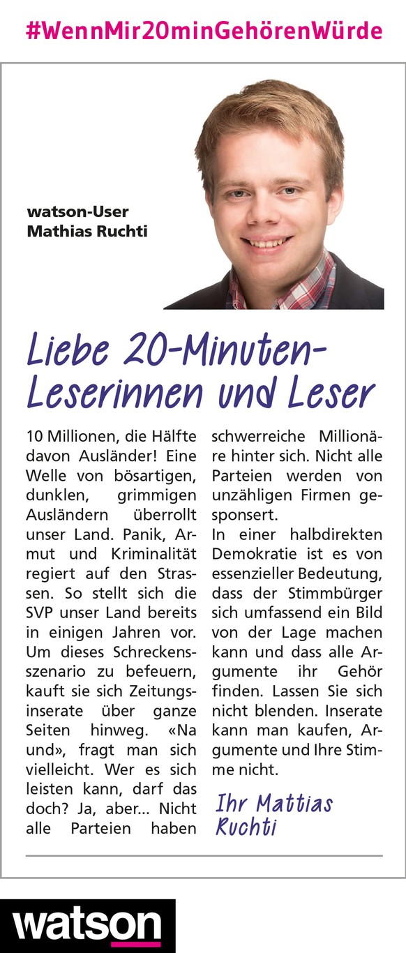 Bei der Gratiszeitung «20 Minuten» hat SVP-Chef Toni Brunner das Editorial gekauft. In der watson-Serie #WennMir20minGehörenWürde dürfen alle anderen eines schreiben. Jetzt ist watson-User Mattias Ruchti dran.
