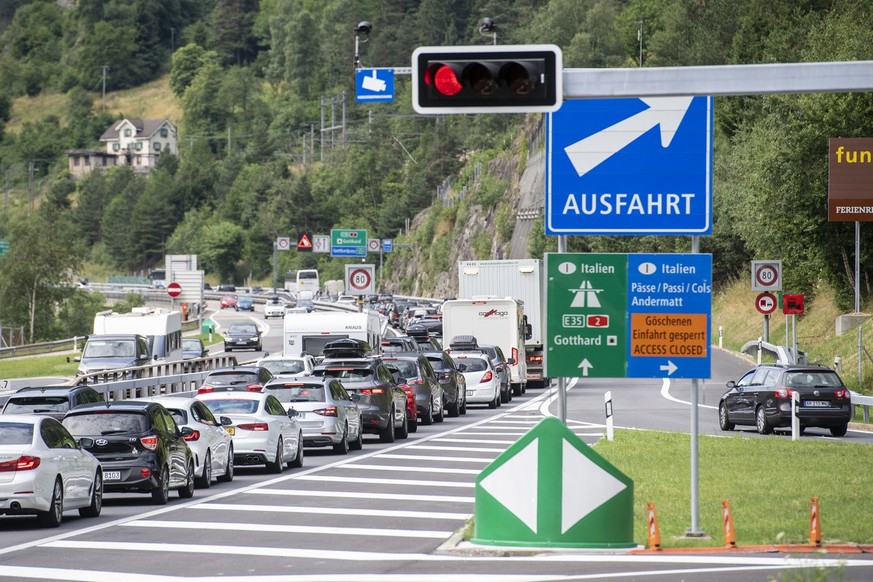 Die Autokolonne vor dem Gotthard-Nordportal ist am frühen Samstagnachmittag zwischen Beckenried NW und Göschenen UR zeitweise auf eine Länge von 16 Kilometern angewachsen. Reisende gen Süden mussten mit einem Zeitverlust von bis zu zwei Stunden und 50 Minuten rechnen.