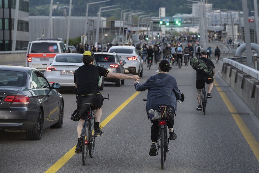 Menschen fahren auf ihren Raedern unter dem Motto: "Critical Mass" durch die Strassen in Zuerich, aufgenommen am Freitag, 28. Mai 2021. (KEYSTONE/Ennio Leanza)