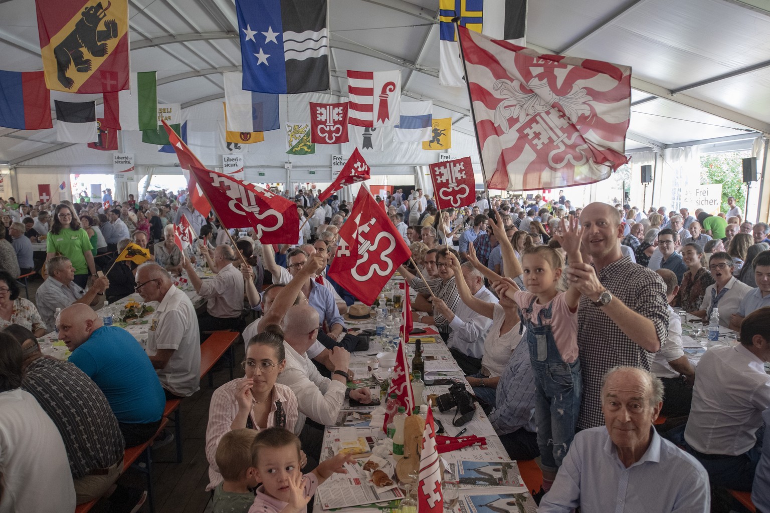 Der «Unterwerfungsvertrag» bildete so etwas wie den roten Faden der Reden und Einspielungen im prallvollen Festzelt. Die Laune bei den rund 800 Parteimitgliedern war gut, teilweise ausgelassen. Es herrschte eine Art trotzige «Jetzt erst recht!»-Stimmung, denn die Umfragen verheissen der SVP für die Wahlen am 20. Oktober kein schönes Ergebnis. Sie muss mit Verlusten rechnen.
