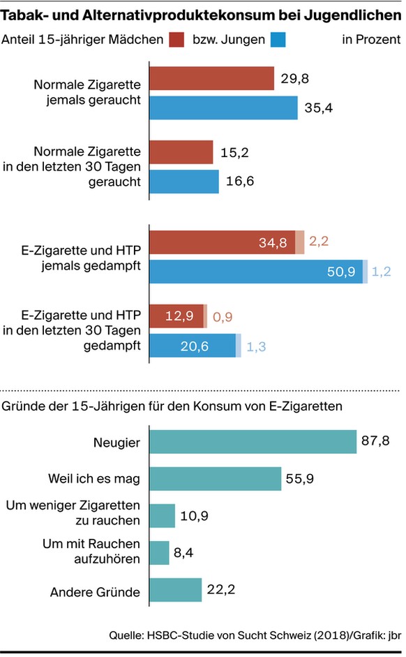 In der Gesundheitsprävention betonen manche Organisationen wie Sucht Schweiz oder das Blaue Kreuz die Gefahren von E-Zigaretten und anderen Alternativprodukten stärker als deren Möglichkeiten zur Schadensminderung. Mit E-Zigaretten würden Jugendliche gezielt nikotinabhängig und so zu lebenslangen Kunden gemacht, so der Vorwurf. Tatsächlich konsumierten 2018 gemäss einer umfassenden Studie von Sucht Schweiz mehr Jugendliche in den letzten 30 Tagen vor dem Befragungszeitpunkt E-Zigaretten als herkömmliche Zigaretten (siehe Grafik).