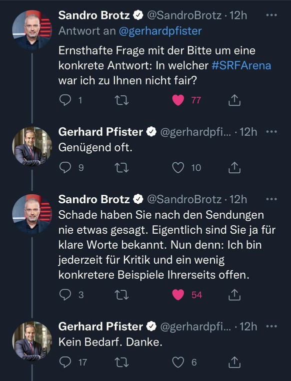 Brotz sagt, dass er darauf hinweisen wollte, dass in der «Arena» Ausgewogenheit und Sachgerechtigkeit zentral seien. «Die Aussage war lediglich: Wir bleiben kritisch in alle politischen Richtungen, unabhängig von welcher Seite Druck kommt.» Die konkrete Kritik von Pfister an seiner Sendung könne er nicht nachvollziehe. Auf Twitter forderte er Pfister auf, ihm Beispiele zu nennen, wo er zu wenig fair war. Pfister ging nicht darauf ein.
