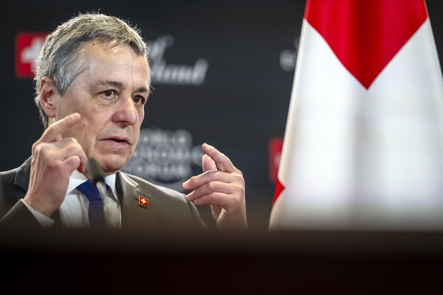 epa12670219 Switzerland's Foreign Minister Ignazio Cassis attends a news conference during the 56th annual meeting of the World Economic Forum, WEF, in Davos, Switzerland, 22 January 2026. The me ...